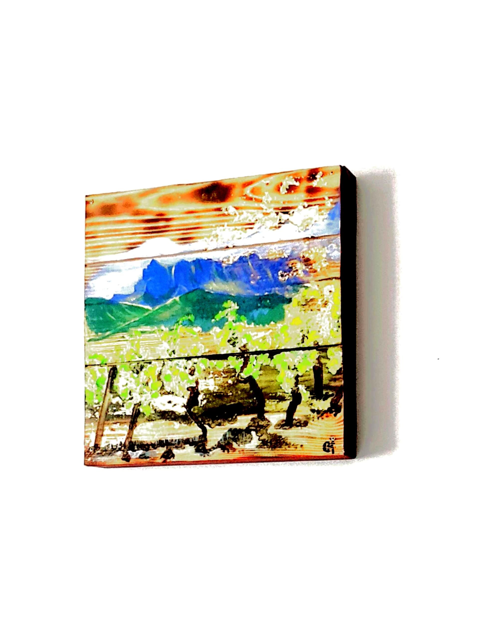Square wooden table, painting on the vine painted in acrylic on the wood, decorated with gold leaf to give a shiny and luminous side. Painting of vines with vine leaves and bunches of grapes. Painting on wood, original painting of beautiful mountains of France painted on burnt wood to give a rustic and modern effect at the same time. Painting of beautiful landscapes, beautiful mountains of France like "Les trois becs". Ideal gift for lovers of the landscapes of France. Natural and original decoration. Gift for a party, a birthday or to decorate its interior. Wall painting with vines, ideal for wall decoration. The edges of the table are wide and painted in brown, the wide edges of the table give volume to the table.