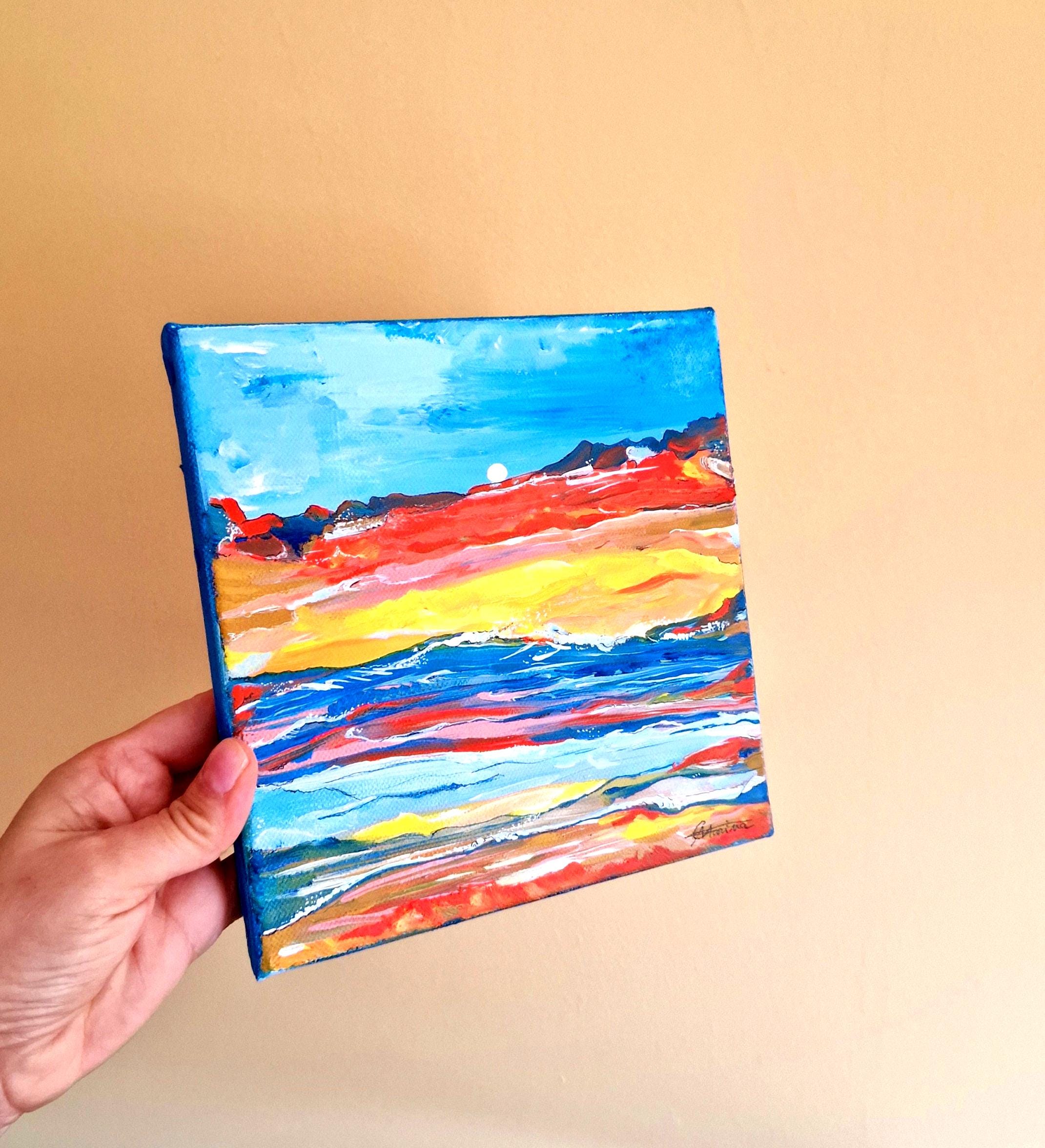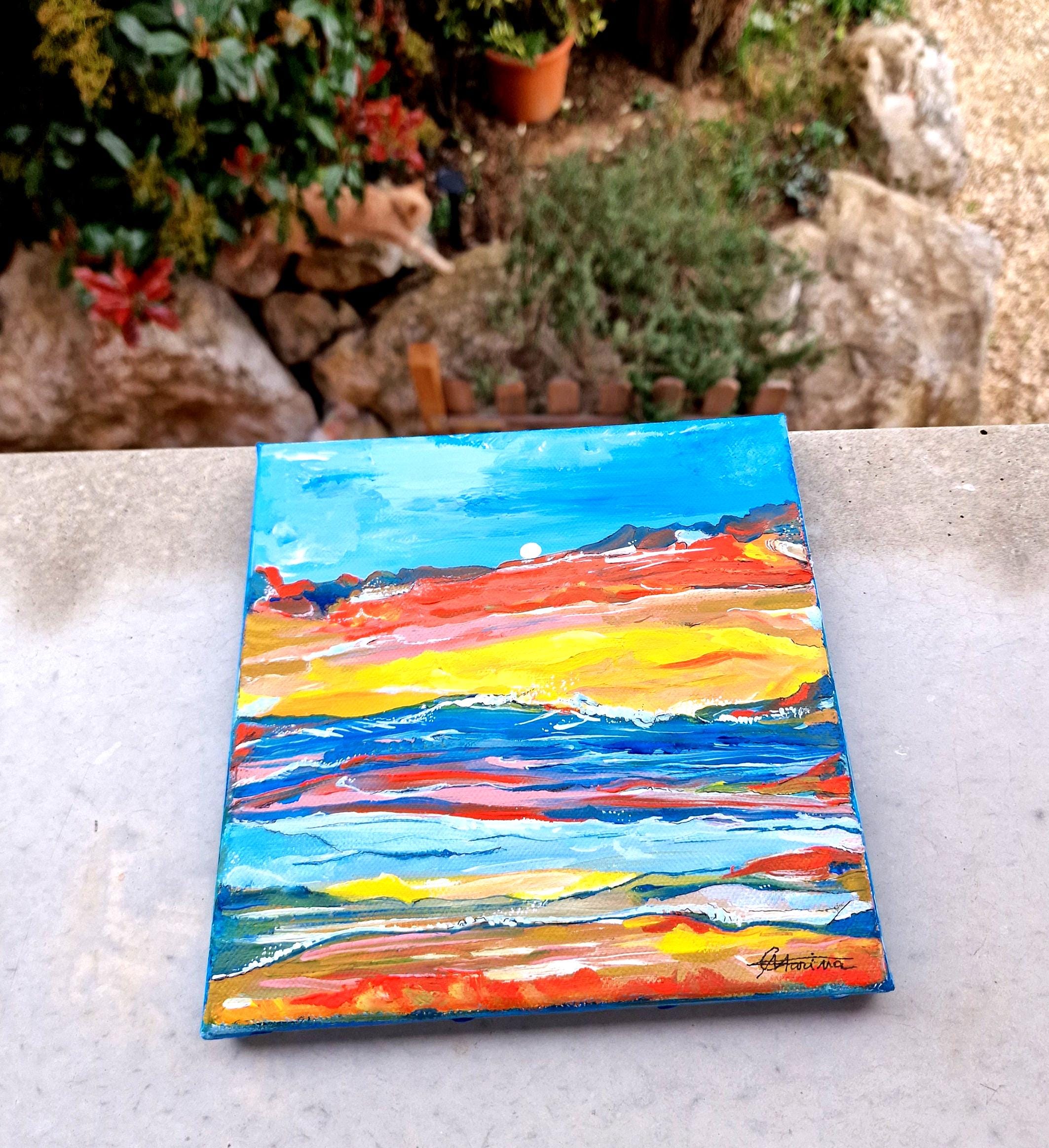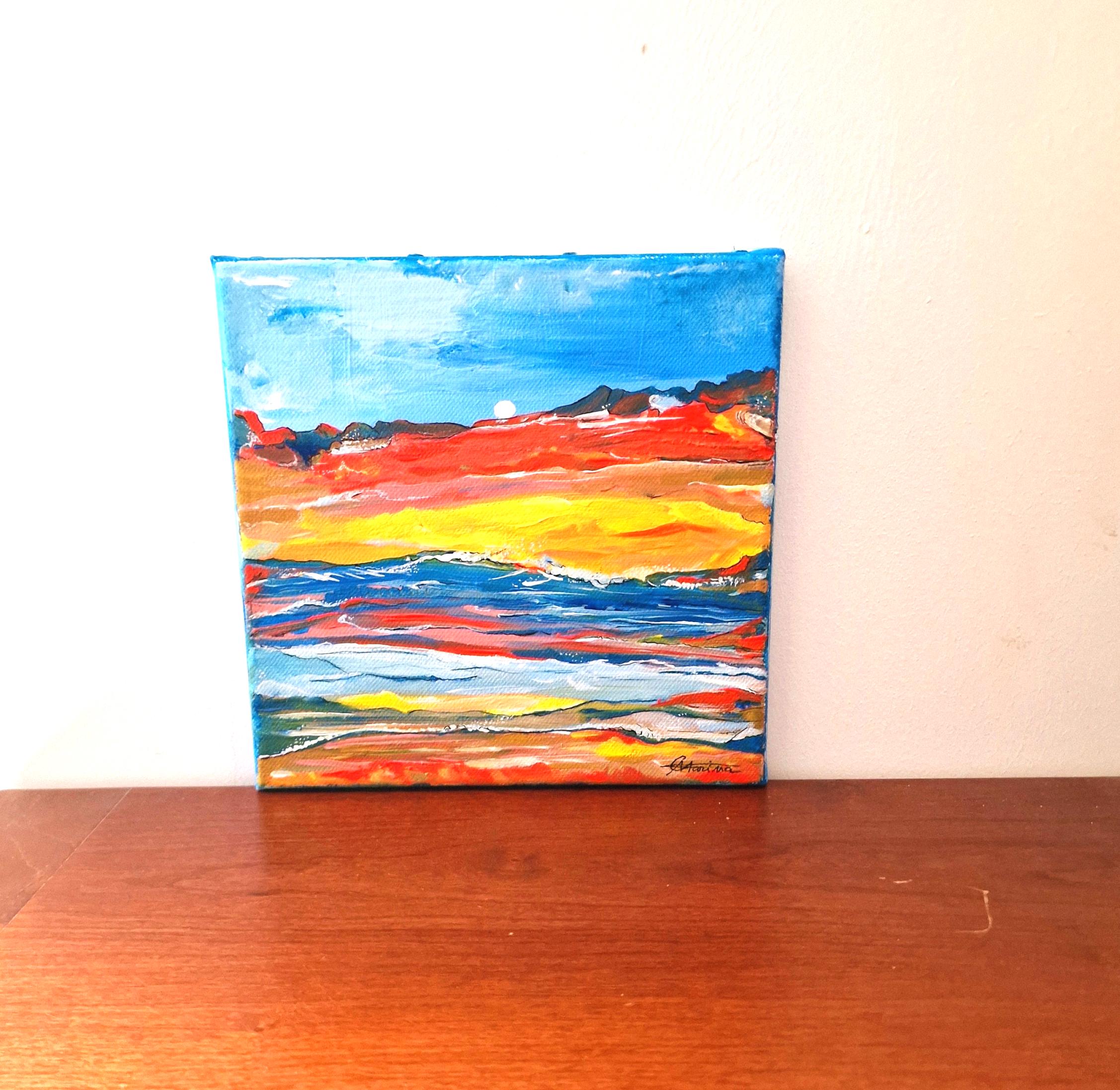 Sunset sea painting painted on square canvas -Table Sea, sunset hand painted on canvas with gouache, square canvas Nature and landscapes - for living room, bedroom. a landscape painting on canvas "Sea Landscapes" to enhance your decoration on the walls of your living room, for the decoration of an office or any other room in your home. Paintings of the sea, sunset canvas, with this style of decoration you will impress your visitors and your walls will be brightened up with these scenes, these colors that will remind you of your travel memories. Hand painting painted.
