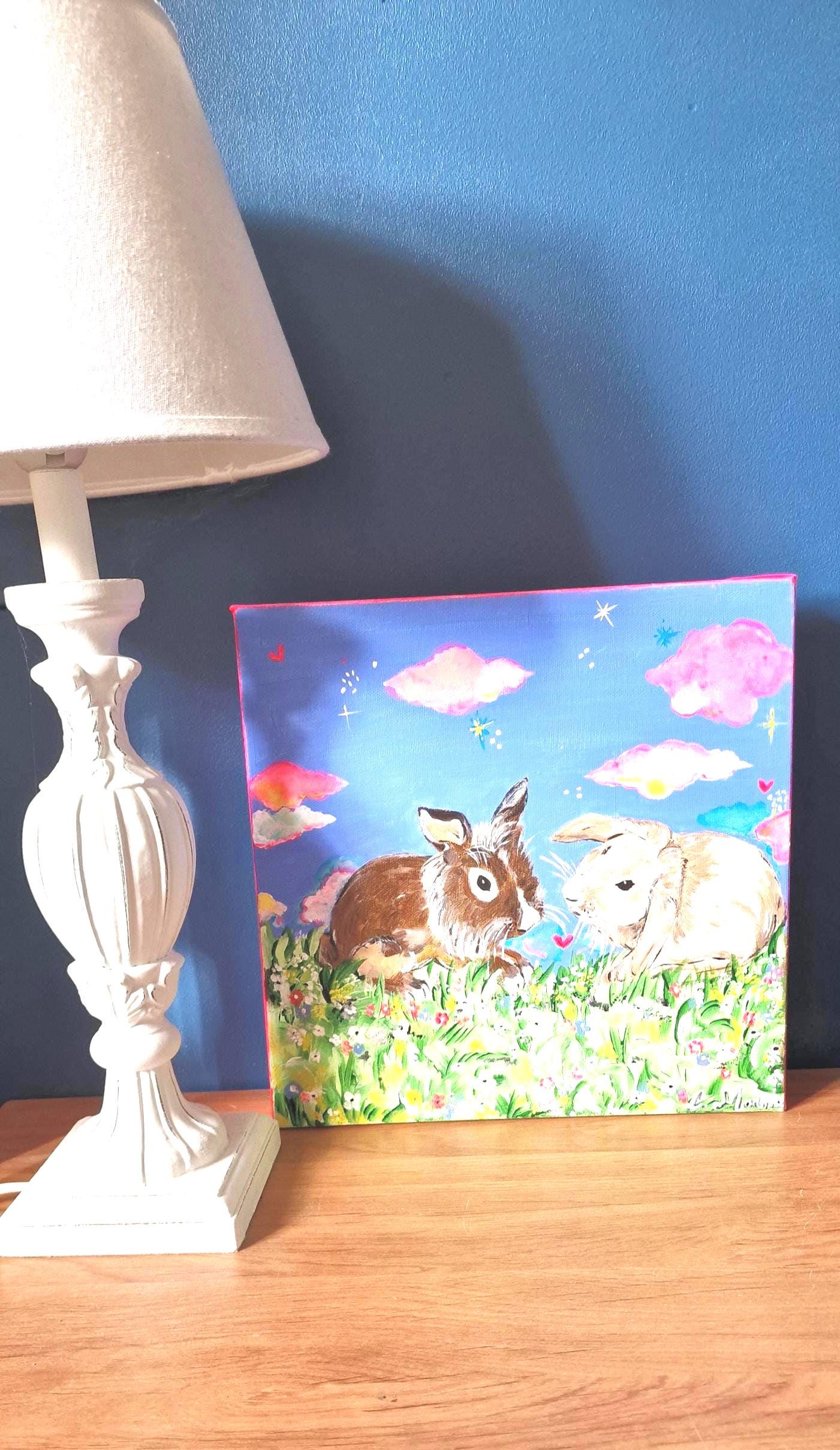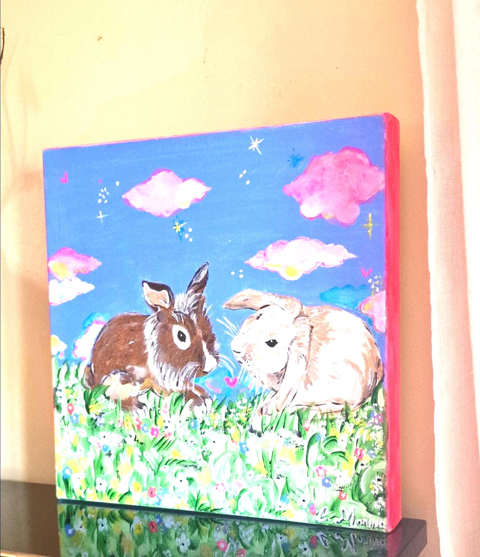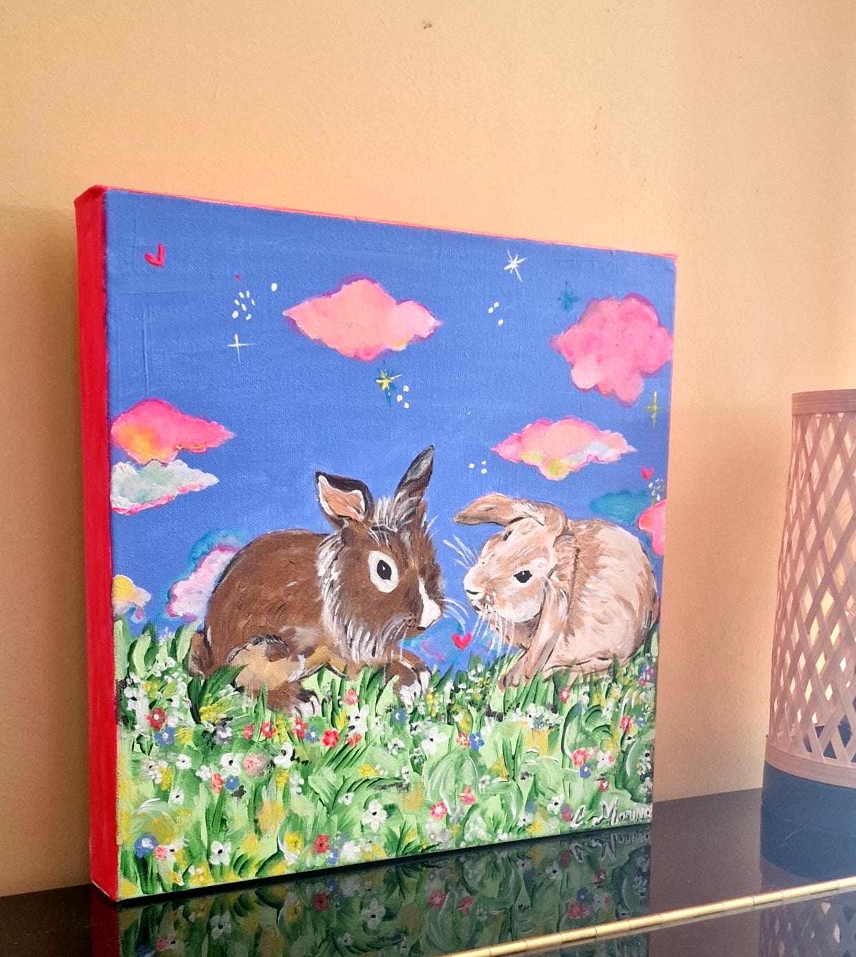 Immerse yourself in a world of tenderness with this original painting on canvas. The artwork depicts two rabbits—one brown with expressive details and the other beige with floppy ears—sharing a tender moment in the heart of a flowery meadow.