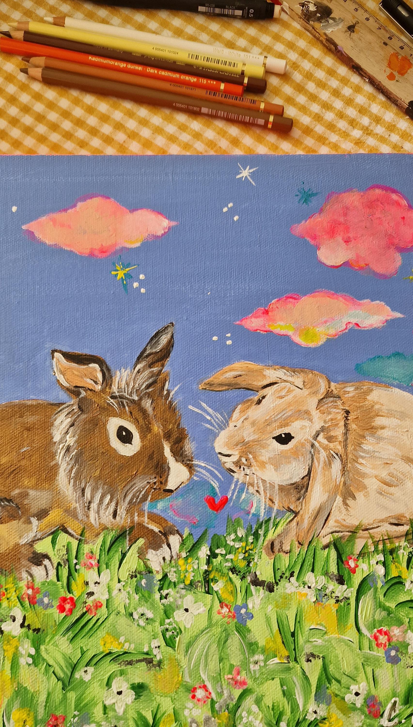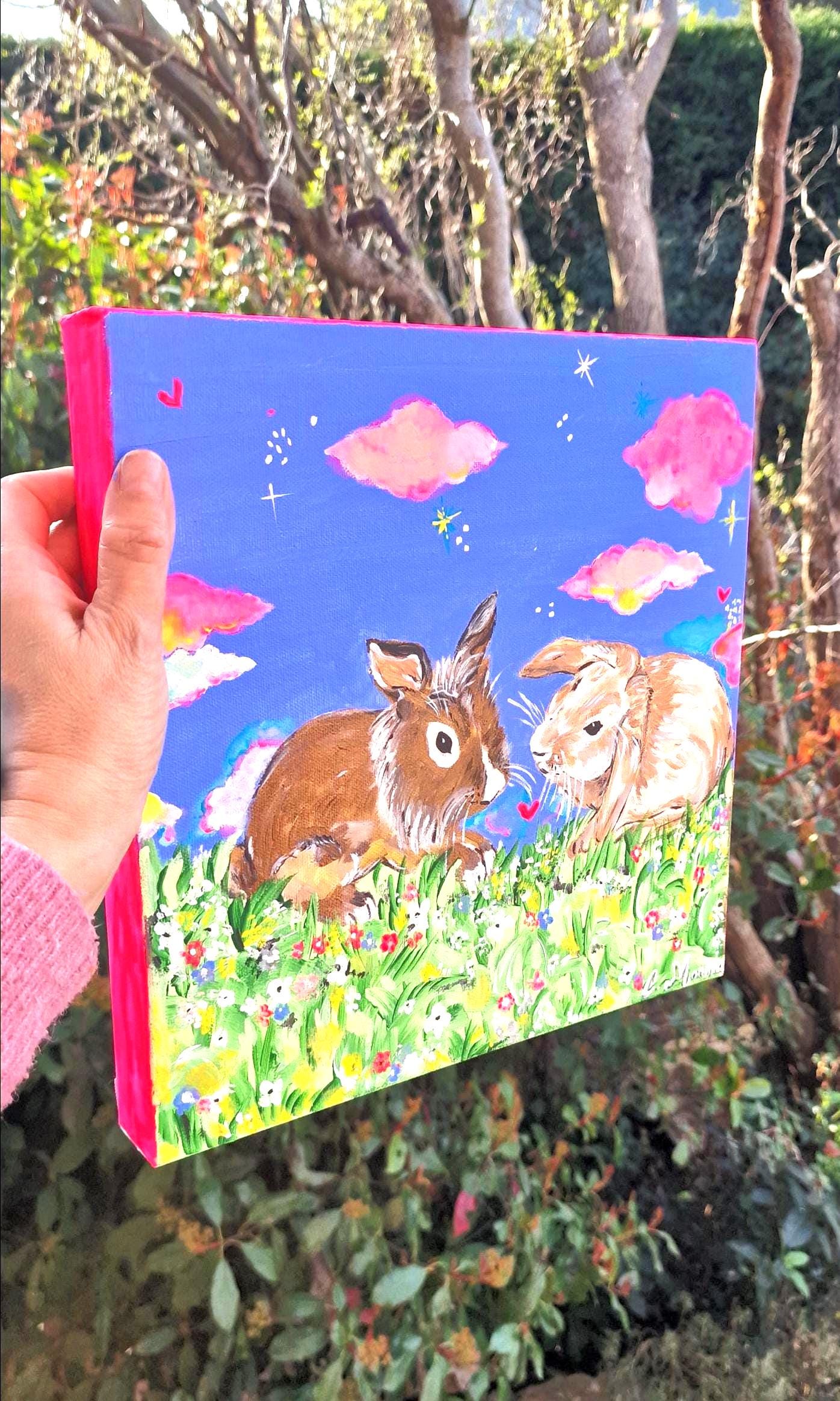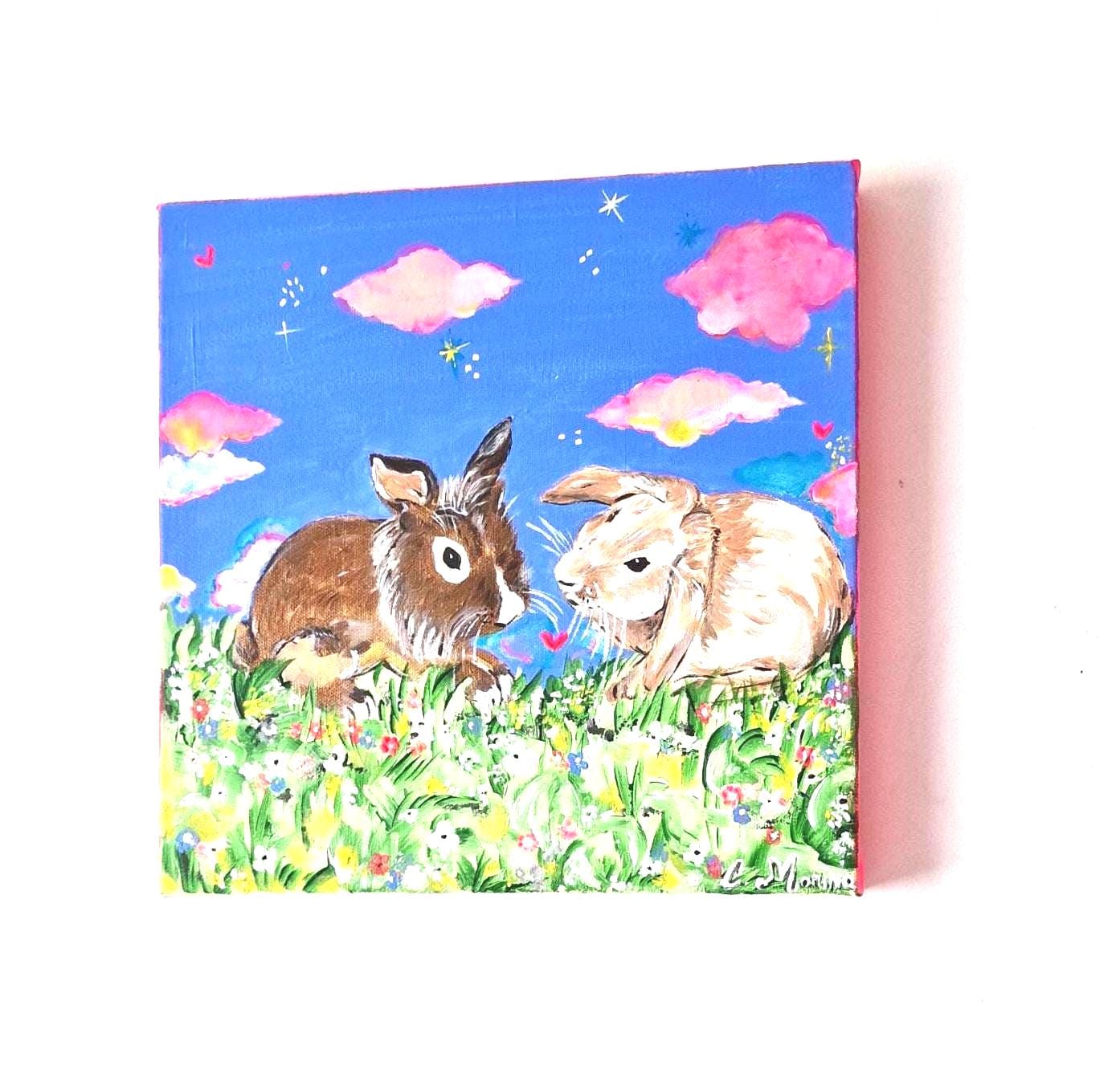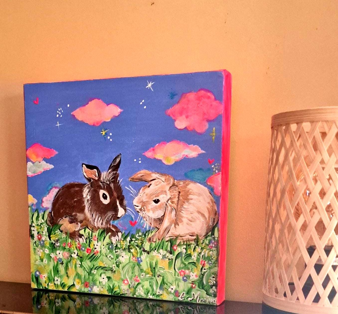 Immerse yourself in a world of tenderness with this original painting on canvas. The artwork depicts two rabbits—one brown with expressive details and the other beige with floppy ears—sharing a tender moment in the heart of a flowery meadow.