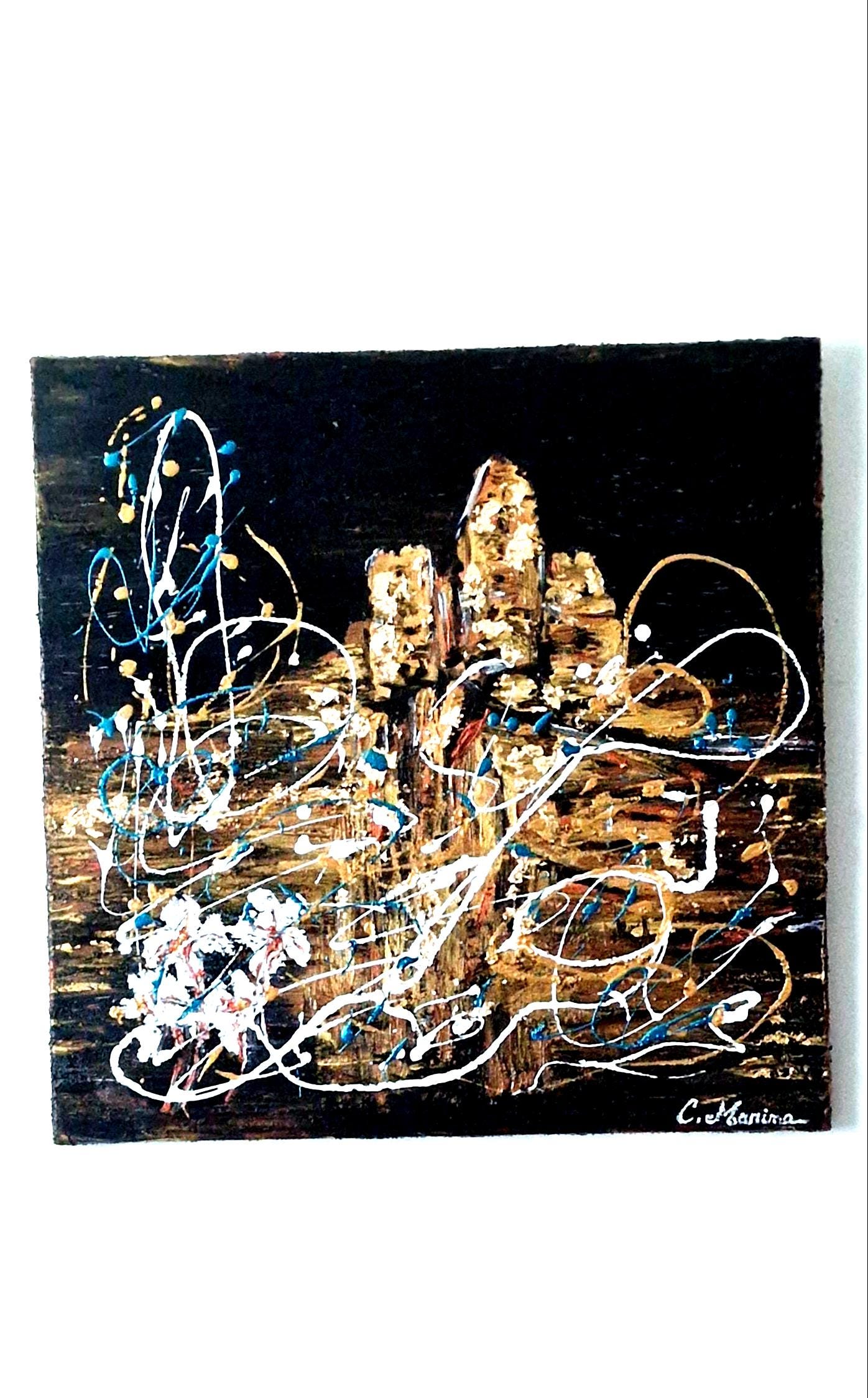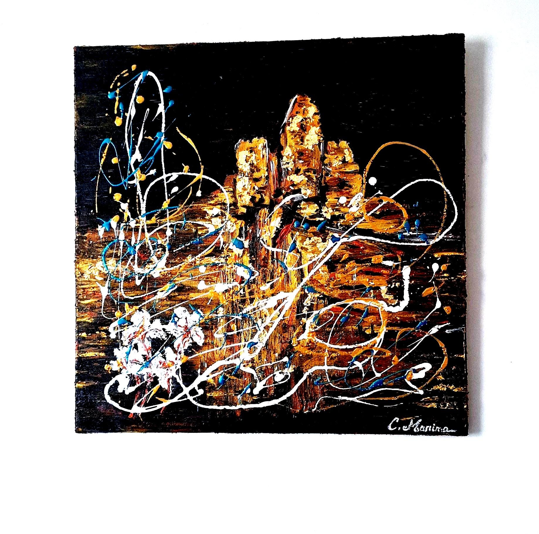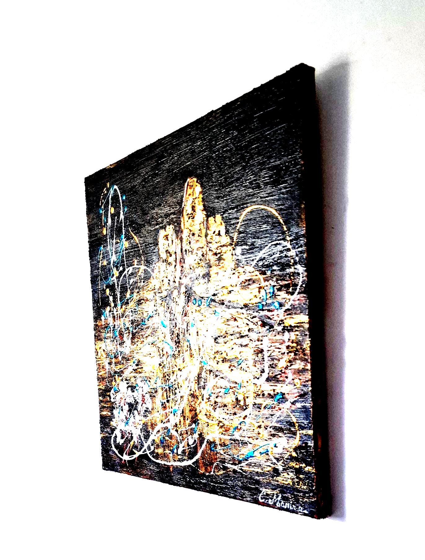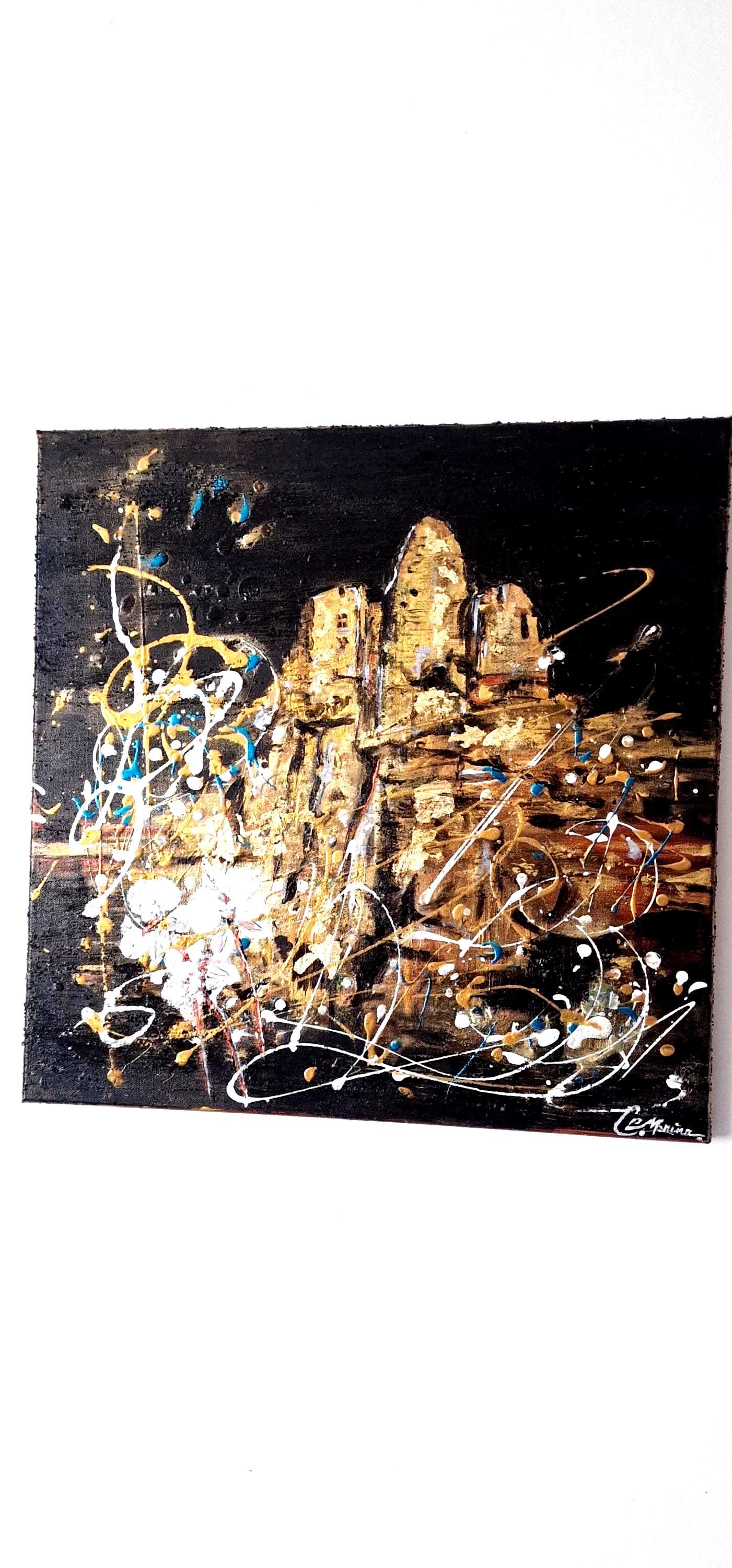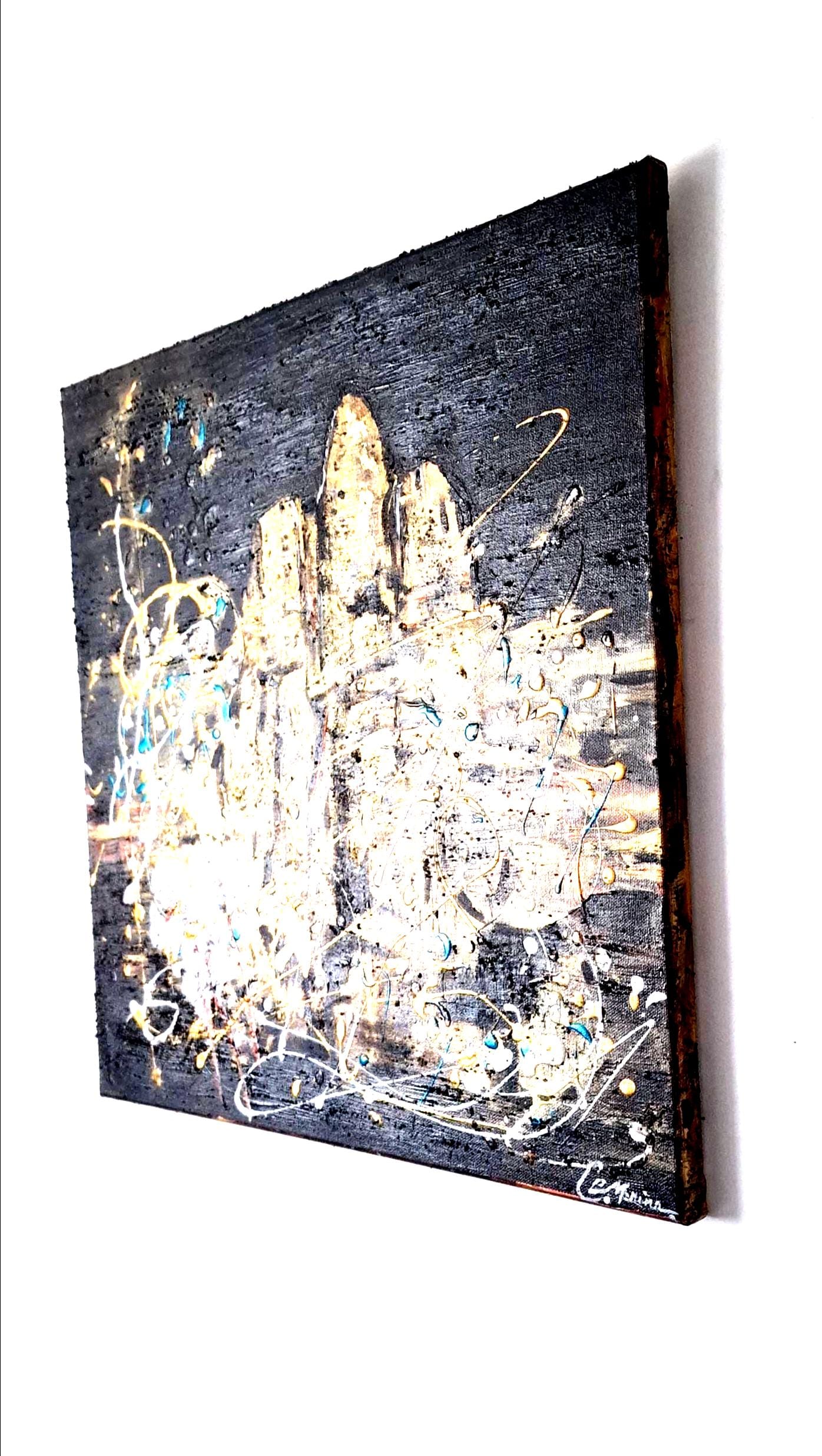 Between abstraction and figuration, the structures rise in golden and copper textures against a deep black background, symbolizing the strength and resilience of history through the centuries. Splashes of white and turquoise energize the composition, evoking the bright southern light and the windswept skies above the Rhône Valley.