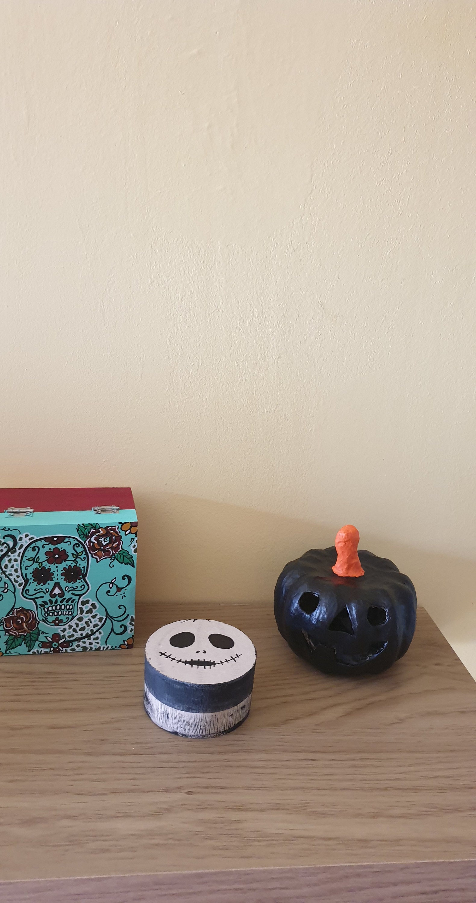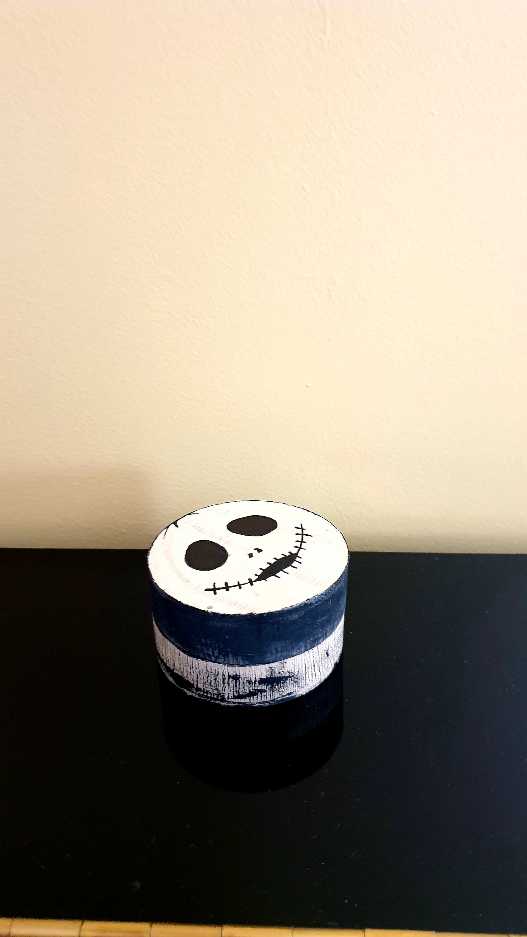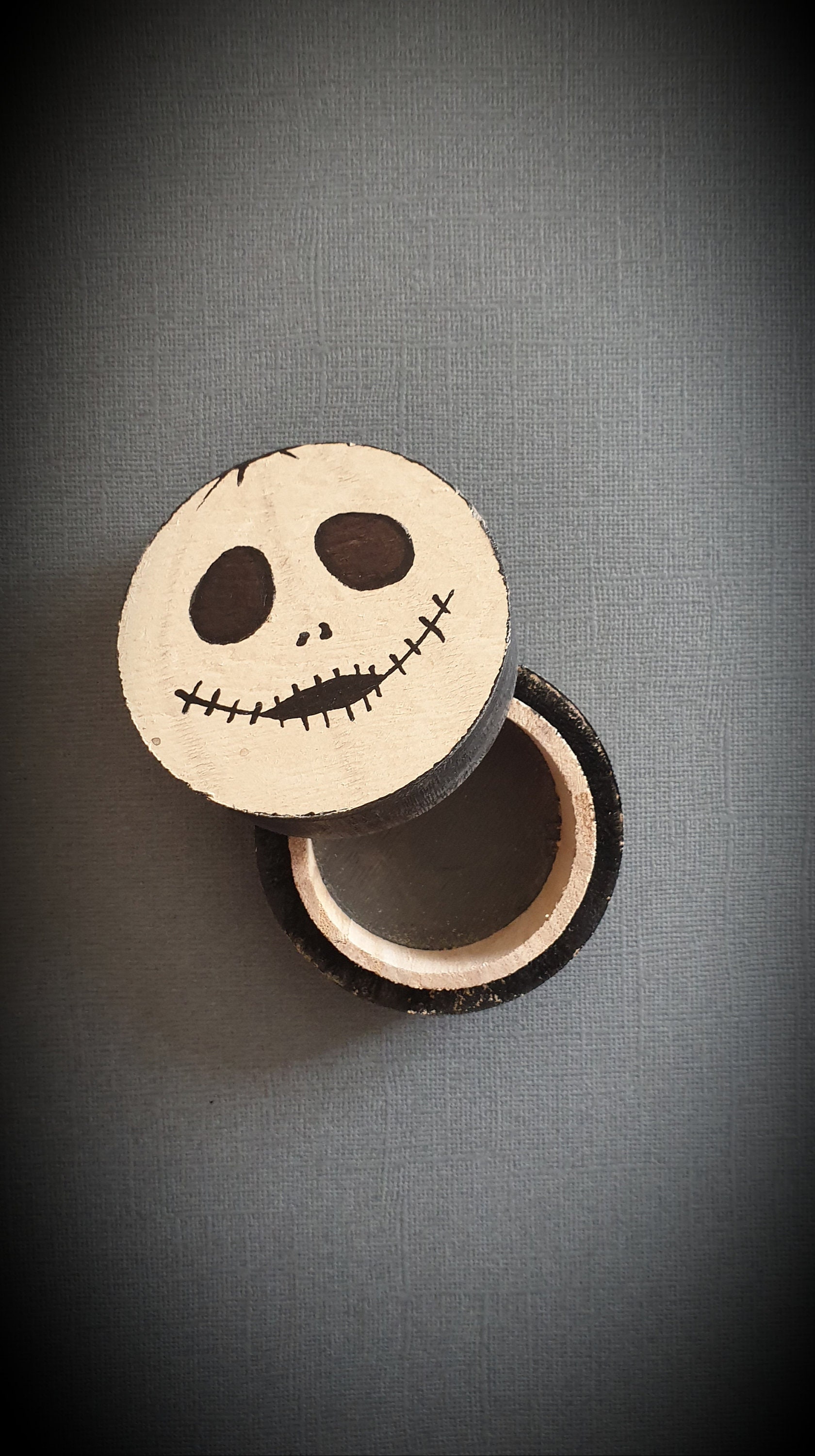 Round box decorated phantom. Small round wooden box. Jewelry box, candy box, jewelry box for surprise. Pomegranate party decoration with black eyes and black stitched mouth. Storage box painted in gray and black beige. Deco monster. Fun gift. Box that can be personalized with your name. Small round box that scares! boo! little monster. Small round box painted in black and beige, big black eyes and sewn black lips. decorative box for storage. Fun box, fun surprise gift.