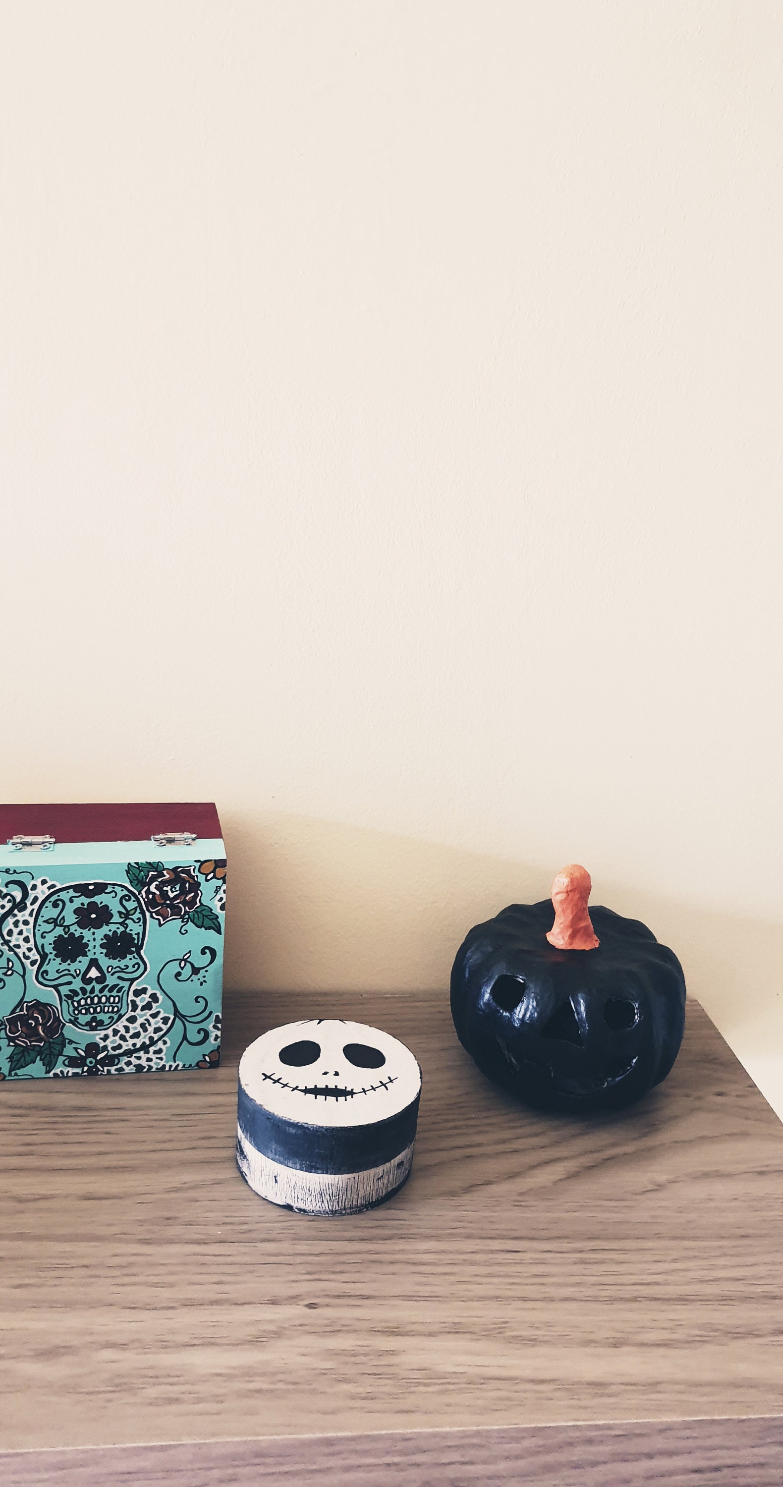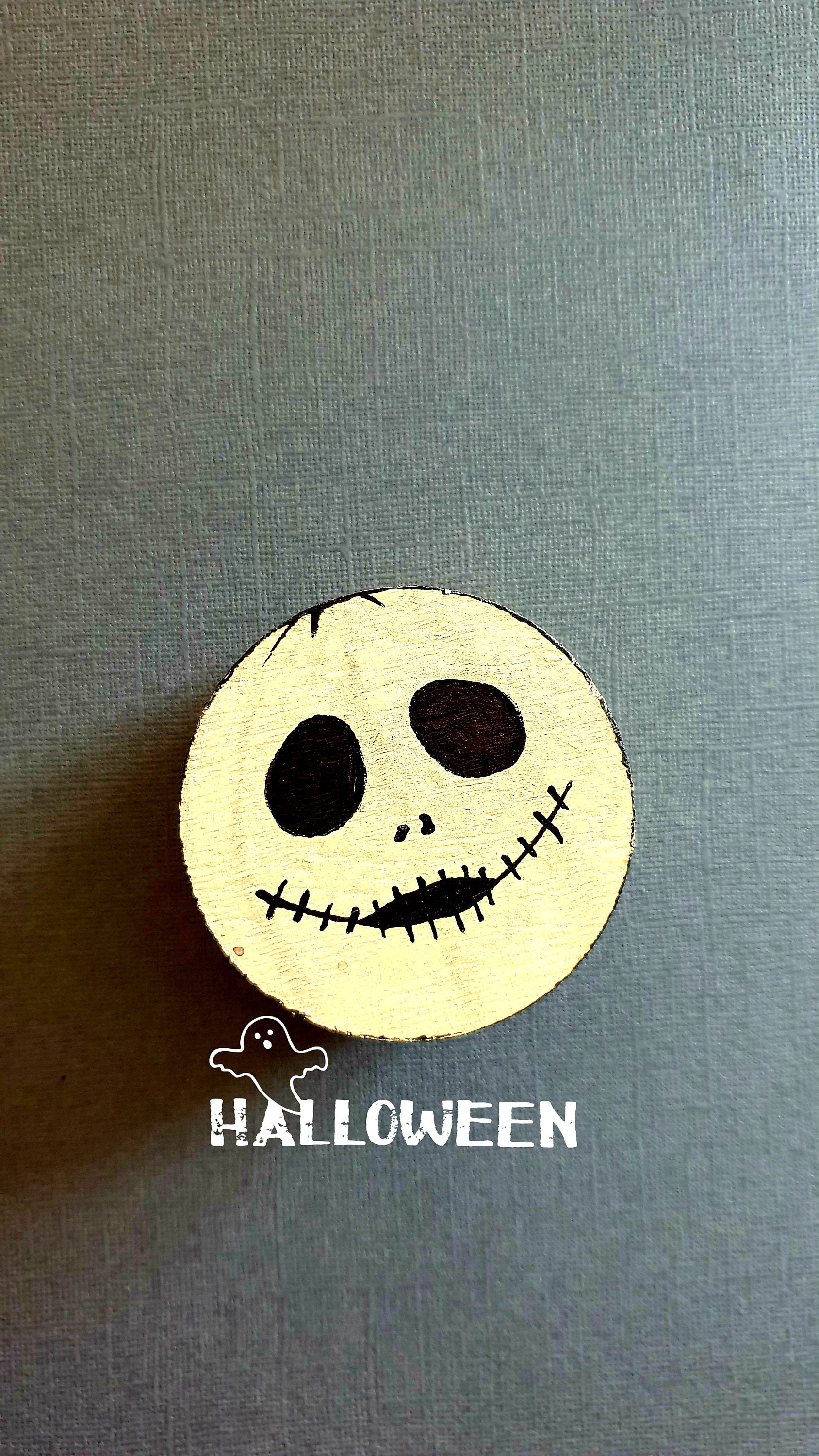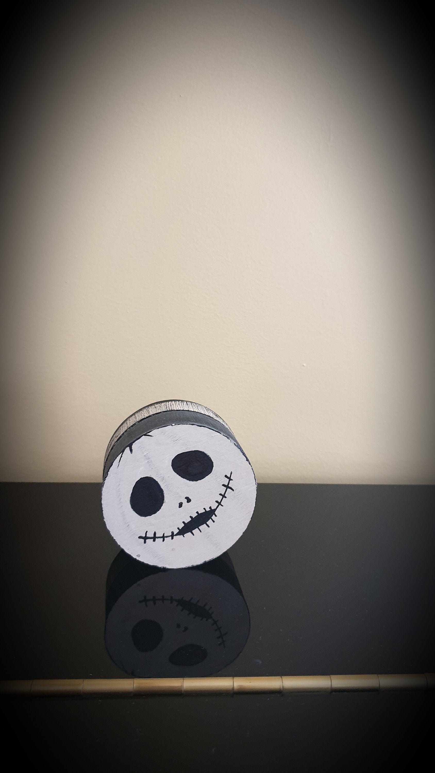 Round box decorated phantom. Small round wooden box. Jewelry box, candy box, jewelry box for surprise. Pomegranate party decoration with black eyes and black stitched mouth. Storage box painted in gray and black beige. Deco monster. Fun gift. Box that can be personalized with your name. Small round box that scares! boo! little monster. Small round box painted in black and beige, big black eyes and sewn black lips. decorative box for storage. Fun box, fun surprise gift.